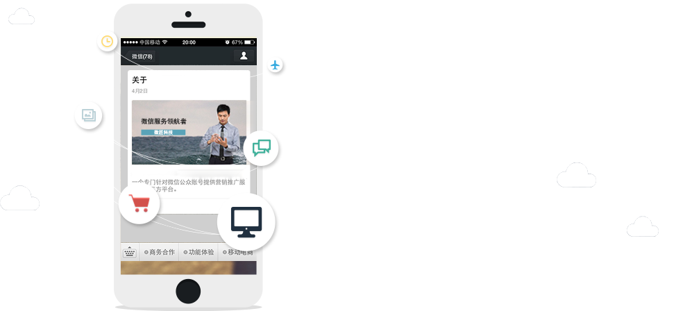 为顾客精心设置四大图文推送功能:顾客扫描二 维码,即可回复图文并茂的欢迎词;通过形象的 菜单界面引导顾客进行微信互动操作;所见即所 得,傻瓜式编辑流程,快速设置需要调用的图文 信息;根据关键字,自动回复设置好文字,图文 或多图文资料,实现信息提示或查询。